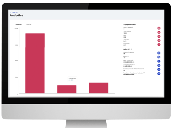 • 17 min average time sessions. • 16% add to cart ratio. • 28% engagement ratio. • After each live event, you can measure the number of viewers and their interactions. • Analytics on likes, comments, carts, purchase orders and average tickets.